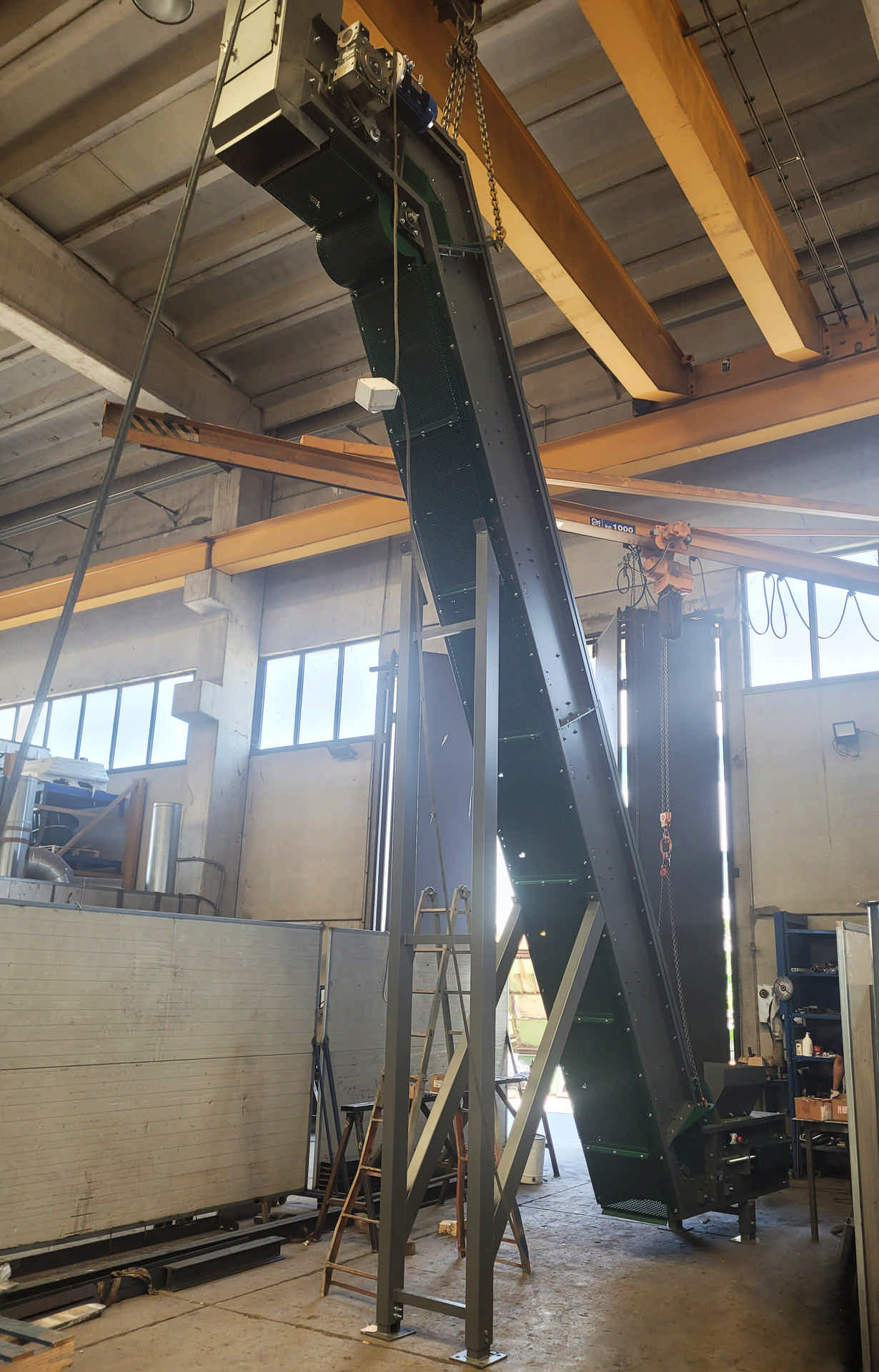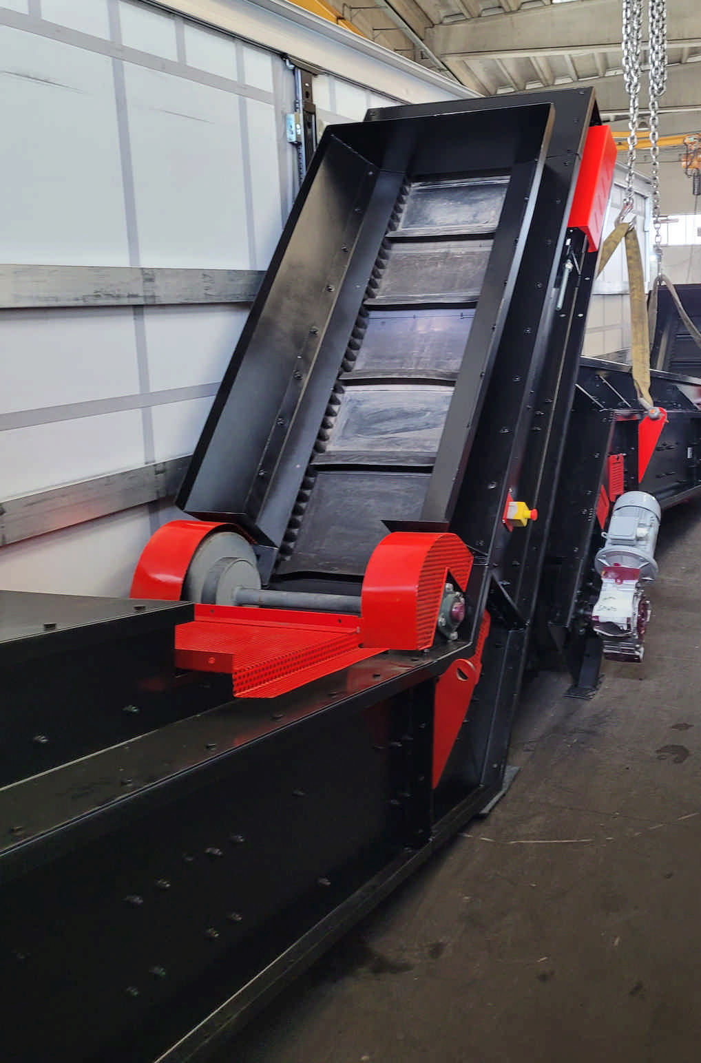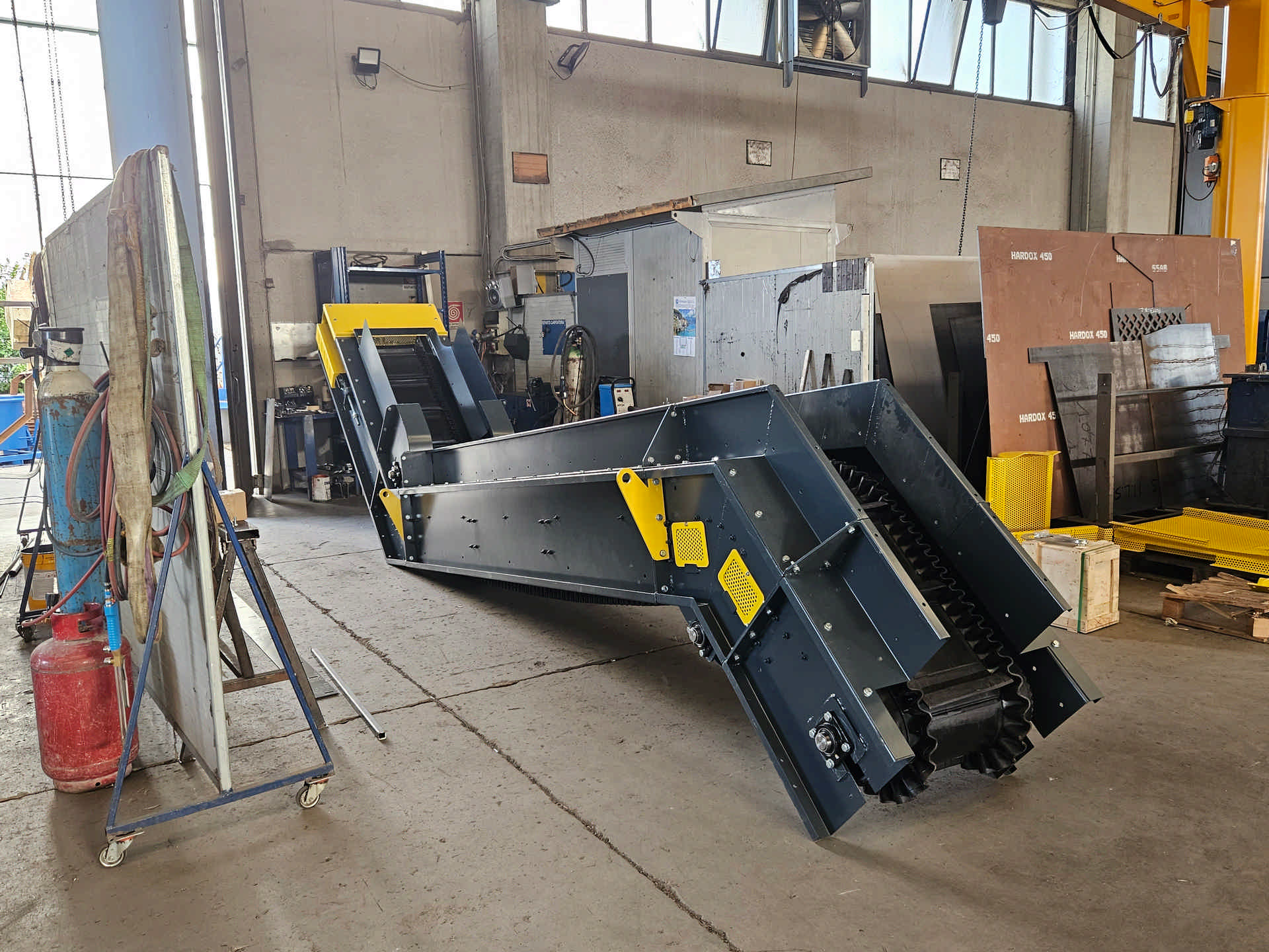 Ogni nastro a doppio collo d’oca è fornito con telo dotato lateralmente di guide in gomma e bordi ondulati e tazze orizzontali in posizione centrale per permettere un’efficiente trasporto del materiale anche con inclinazioni elevate.