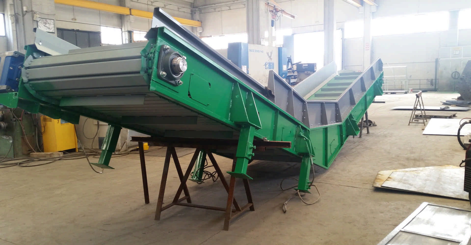 Tutti i nastri a doppio collo d’oca sono realizzati con opportuna tramoggia di carico e cuffia di scarico.